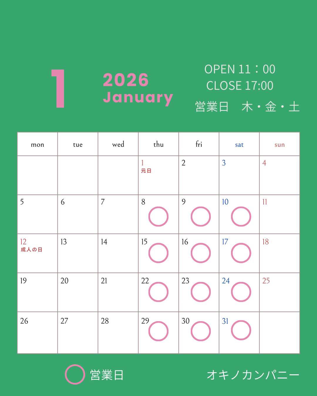 1月の営業日です